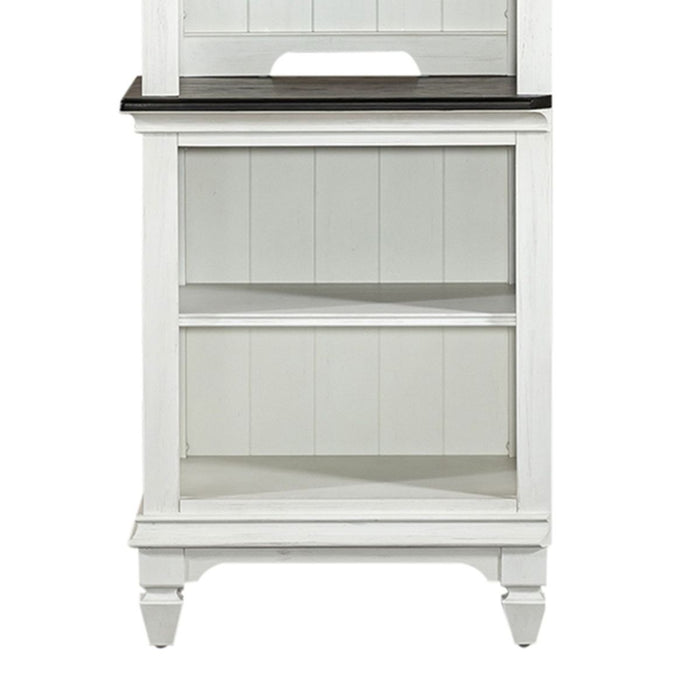 Liberty Allyson Park Left Pier Base in Wirebrushed White 417-EL00B. Maximize storage and convenience with the Allyson Park left pier base. Crafted with pine solids and veneers, this piece features a wire brushed white finish with charcoal tops, bead molding, a planked back panel, and fixed shelving anchored by square tapered legs. Pair with the left pier top, right pier unit, entertainment hutch and 72" entertainment stand to complete the set, as this piece cannot stand alone.